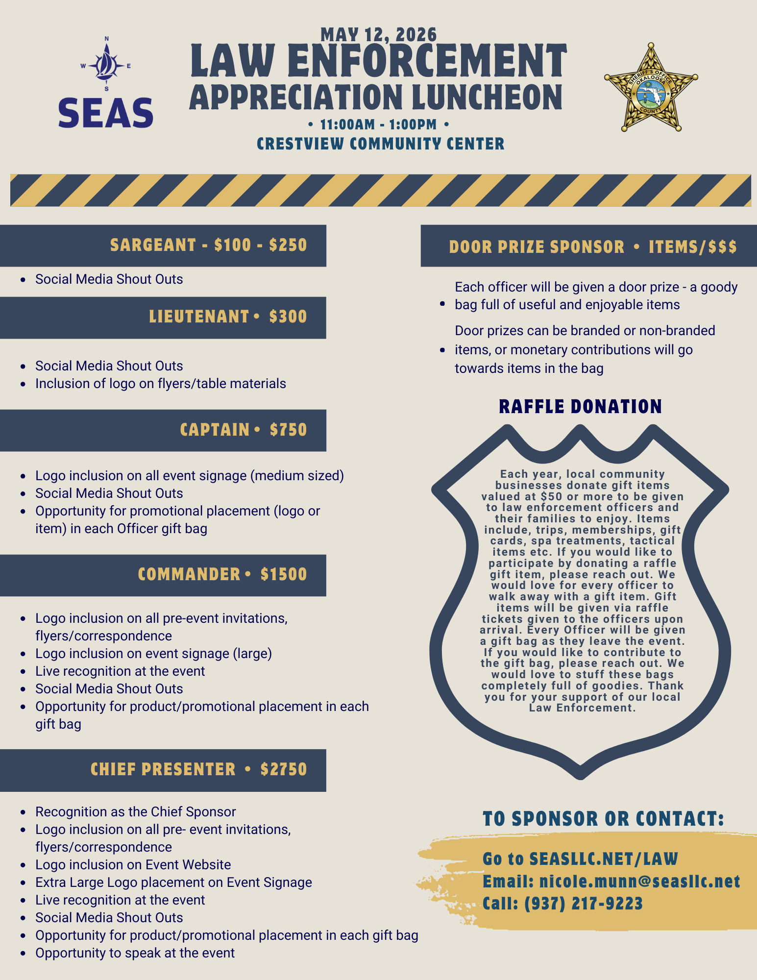 Checks may be mailed to: SEAS - Attn: Law Enforcement Luncheon, 6575 Highway 189N, Baker, FL 32531