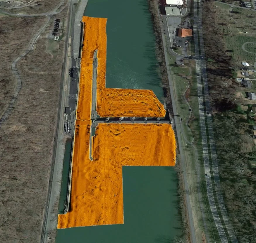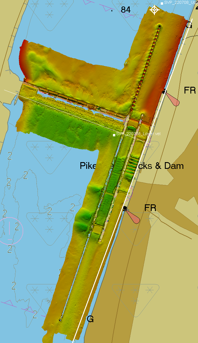 Using advanced technology like hydrographic multibeam and high-resolution side scan sonar, we assessed scour erosion – a process where fast-moving water wears away at the foundation of dams and other structures. By conducting follow-up surveys, we can monitor any undercutting or significant erosion that might affect key parts of the dam, such as piers, aprons, lock chamber walls, and abutments. This type of continuous monitoring is vital for identifying early signs of damage, ensuring that repairs can be made before problems escalate.